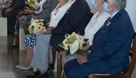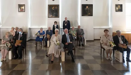 W Ratuszu Staromiejskim w Toruniu 6 lipca 2021 roku 18 par małżeńskich zostało odznaczonych Medalami za Długoletnie Pożycie Małżeńskie. Po ponad roku przerwy spowodowanej pandemią kilka tygodni temu powrócono w Toruniu do tej pięknej tradycji, przy zachowaniu niezbędnych środków ostrożności. 6 lipca odznaczenia odebrały z rąk prezydenta Torunia Michała Zaleskiego dwie, 9-osobowe grupy jubilatów – o godz. 14.00 i 15.30. Fot. Wojtek Szabelski