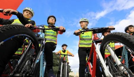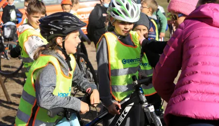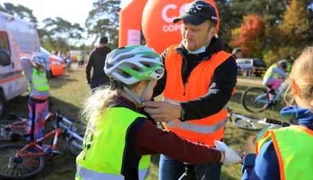 Toruńska Olimpiada Przedszkoli i Szkół 2021/2022 została zainaugurowana wyścigami kolarskimi uczniów z 7 toruńskich szkół podstawowych w dniu 13 października 2021 r. na Placu Cyrkowym. Na trasie obecni byli także Michał Kwiatkowski, Michał Gołaś i Łukasz Owsian, kolarze z najlepszych grup zawodowych na świecie. Fot. Sławomir Kowalski