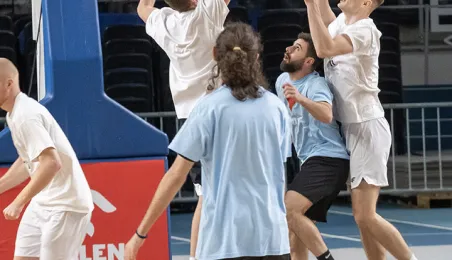Studenci i studentki UMK, studenci Erasmus, zawodnicy AZS-u UMK oraz toruńscy sportowcy rozegrali 16 listopada 2023 r. w Arenie Toruń mecz koszykówki w ramach Toruńskiego Tygodnia Tolerancji. Fot. Wojtek Szabelski
