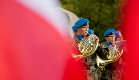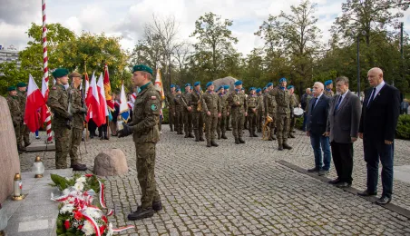 Przy obelisku „Ku czci poległych i pomordowanych przez hitlerowskiego najeźdźcę w latach 1939-1945” na Skwerze im. Oficerskiej Szkoły Artylerii w Toruniu odbyła się uroczystość patriotyczna z okazji 84. rocznicy wybuchu II wojny światowej. Fot. Agnieszka Bielecka