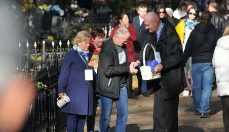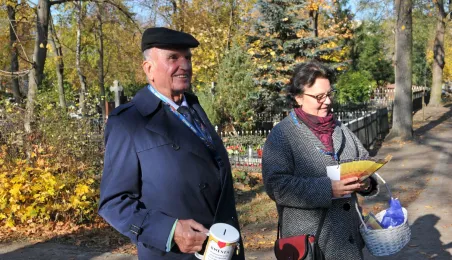 1 listopada 2021 r. po raz dziewiętnasty odbyła się kwesta na cmentarzu św. Jerzego, organizowana przez Urząd Miasta i Towarzystwo Miłośników Torunia. Znani torunianie i goście miasta zbierali datki na odnowę zabytkowych pomników najstarszej toruńskiej nekropolii. Prezydent Torunia Michał Zaleski złożył też kwiaty na gromach honorowych obywateli i osób zasłużonych dla miasta. Fot. Małgorzata Litwin