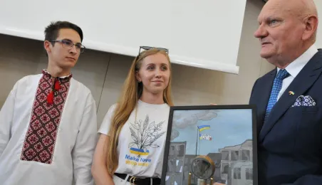 Toruń opuszcza grupa młodych wolontariuszy z Ukrainy. 23 września 2023 r. spotkał się z nimi prezydent Torunia Michał Zaleski. Młodzi ludzie z różnych miast Ukrainy m.in. ze Lwowa, Odessy, Żytomierza, Czernihowa, Mariupola i Połtawy przez miesiąc uczestniczyli w pracach Toruńskiego Sztabu Pomocy Ukrainie – jednej z kilku działających w Toruniu organizacji pozarządowych zajmujących się pomocą obywateli Ukrainy. W podziękowaniu za serdeczne przyjęcie w Toruniu uczestnicy wręczyli Michałowi Zaleskiemu flagę Ukrainy ze swoimi autografami, motankę czyli ukraińską laleczkę w stroju ludowym, statuetkę wykonaną z fragmentu rakiety oraz obrazek z flagą Toruńskiego Sztabu Pomocy Ukrainie osadzoną na ruinach zrujnowanego miasta. Fot. Małgorzata Litwin