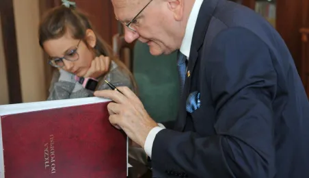 8 listopada 2022 r. w Urzędzie Miasta Torunia gościła 9-letnia Zuzanna Derkowska, zwyciężczyni tegorocznej edycji konkursu "Prezydentem być". W nagrodę wraz z tatą przez cały dzień towarzyszyła prezydentowi Michałowi Zaleskiemu w jego codziennej pracy, m.in. w porannej prasówce, przeglądzie pism urzędowych oraz spotkaniu z toruńskimi kombatantami w Dworze Artusa z okazji Święta Niepodległości. Fot. Małgorzata Litwin (UMT), Sławomir Kowalski (Dwór Artusa)