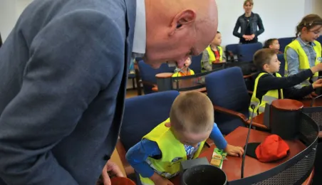 Urząd odwiedziły 25 maja 2022 r. dzieci z Przedszkola Miejskiego nr 5 przy ul. Dekerta w Toruniu. Spotkali się z nimi radny Bartłomiej Jóźwiak, inicjator spotkania, i prezydent Torunia Michał Zaleski. Fot. Małgorzata Litwin