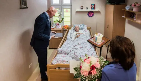 Pani Anna Jastrzębska, mieszkanką Torunia, skończyła sto lat. Do życzeń dla jubilatki przyłączył się prezydent Michał Zaleski, który odwiedził dostojną jubilatkę w dniu 13 czerwca 2022 r. z bukietem kwiatów i upominkiem. Fot. Lech Kamiński