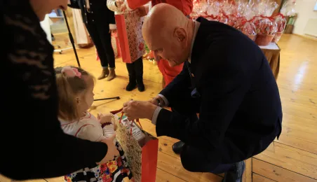 22 grudnia 2023 r. przy wspólnym, wigilijnym stole w Międzynarodowym Centrum Spotkań Młodzieży zasiedli przedstawiciele toruńskiego samorządu i przebywający w naszym mieście uchodźcy z Ukrainy. W świątecznie udekorowanej restauracji "Młyn Smaków" na gości czekały wigilijne potraw i Mikołaj z paczkami i prezentami. Po życzeniach prezydenta Torunia Michała Zaleskiego, błogosławieństwa zebranym udzielił w języku ukraińskim ks. Mikołaj Hajduczenia. W oprawie wigilijnego spotkania wystąpił zespół śpiewający przepięknie ukraińskie i polskie kolędy w składzie: Michał Hajduczenia, Magdalena Cysewska oraz Olena Gajdyszuk. Organizatorem wydarzenia był Wydział Zdrowia i Polityki Społecznej Urzędu Miasta Torunia. Fot. Sławomir Kowalski