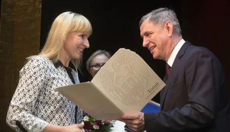 26 marca 2017 r., na dzień przed oficjalnymi obchodami, w toruńskim Baju Pomorskim odbyła się uroczystość z okazji Międzynarodowego Dnia Teatru. Uhonorowano podczas niej osoby związane z toruńskimi teatrami. Najwyzsze odznaczenie Prezydenta Miasta Torunia - medal Thorunium otrzymała w 40-lecie pracy zawodowej Emilia Betlejewska, reżyserka, scenarzystka, pedagog i wieloletnia szefowa teatru dla dzieci "Zaczarowany Świat". Fot. Wojtek Szabelski