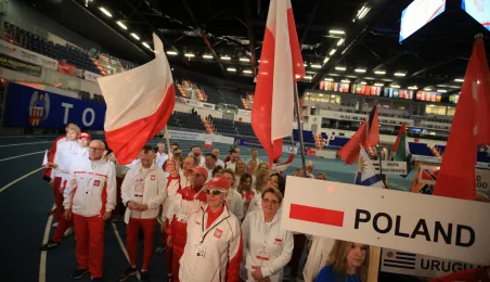 - To dla nas zaszczyt i radość, że możemy gościć Was w naszym pięknym zabytkowym Toruniu, gdzie Stare Miasto wpisane jest na listę Światowego Dziedzictwa Kultury UNESCO. Życzę wszystkim, aby czas spędzony w Toruniu był czasem dobrze spędzonym, aby te mistrzostwa pozostały na zawsze w pamięci - tymi słowami prezydent Torunia Michał Zaleski otworzył 9. Halowe Mistrzostwa Świata w Lekkiej Atletyce Masters 2023. Zdj. Sławomir Kowalski