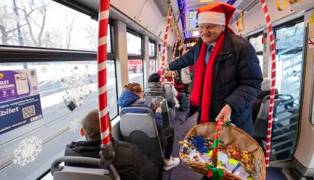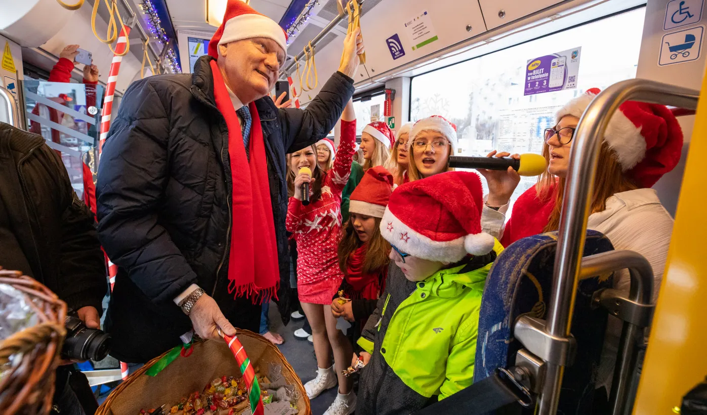 6 grudnia 2023 roku w Toruniu rozpoczął kursowanie tramwaj świąteczny. W inauguracyjnym przejeździen na północ Torunia wziął udział Prezydent Michał Zaleski. / fot. Agnieszka Bielecka