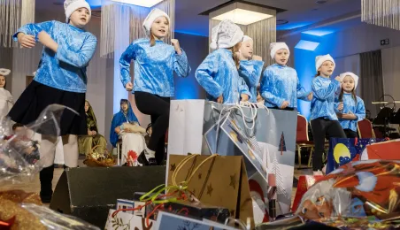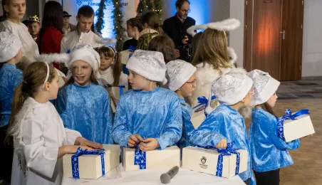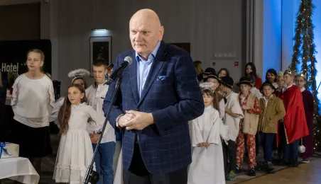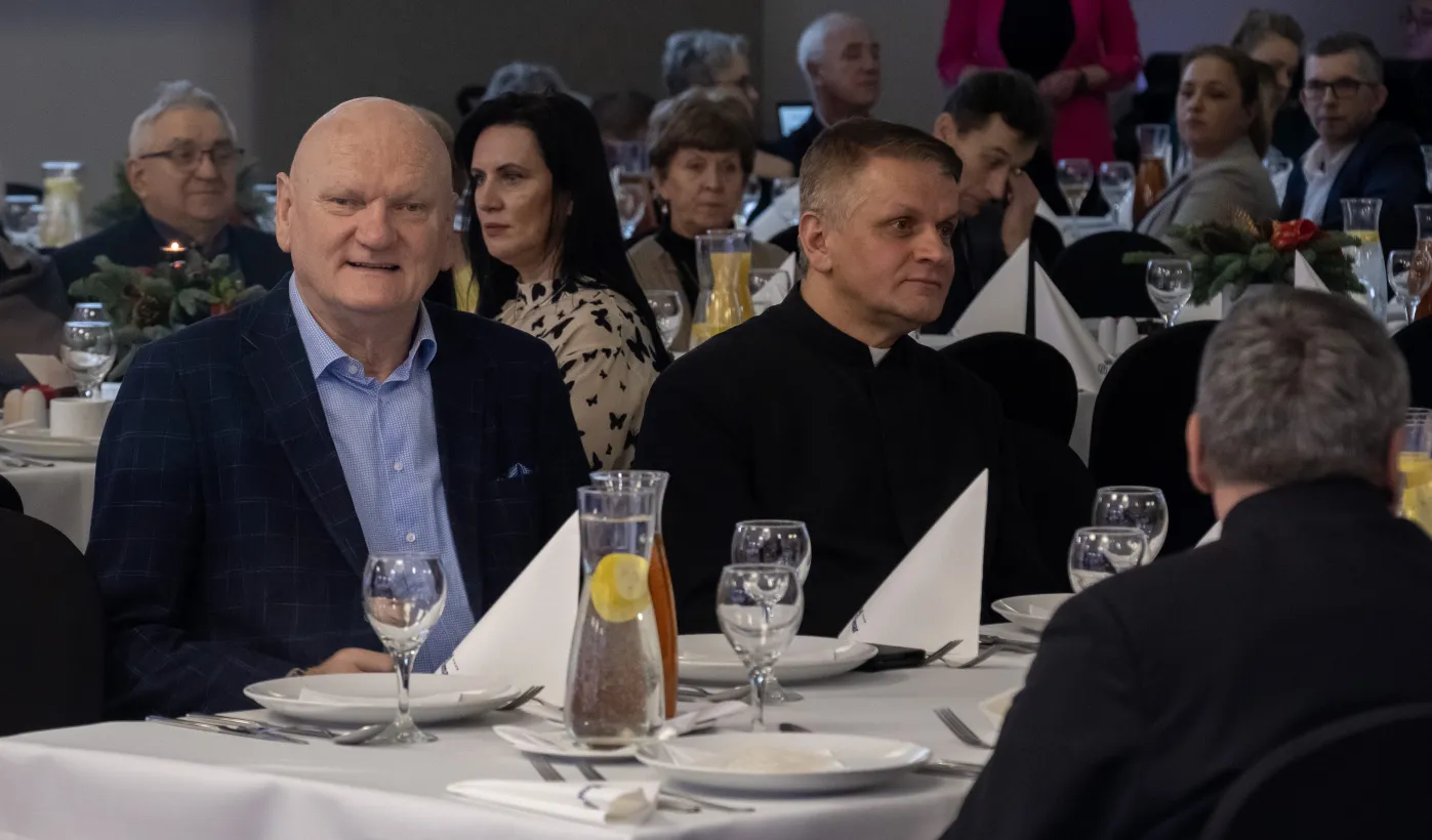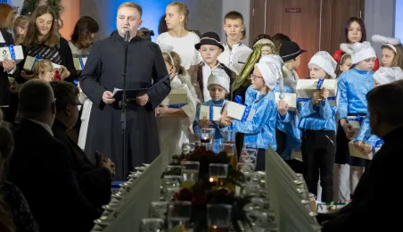 W Hotelu Filmar w Toruniu 17 grudnia 2023 r. odbył się Wieczór Wigilijny Oratorium im. ks. B. Markiewicza. W spotkaniu wziął udział prezydent Torunia Michał Zaleski, który przywiózł dzieciom prezenty i złożył najserdeczniejsze życzenia świąteczne. Fot. Wojtek Szabelski