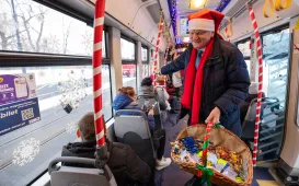 6 grudnia 2023 roku w Toruniu rozpoczął kursowanie tramwaj świąteczny. W inauguracyjnym przejeździen na północ Torunia wziął udział Prezydent Michał Zaleski. / fot. Agnieszka Bielecka