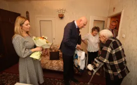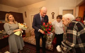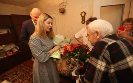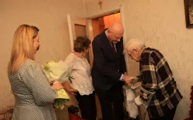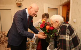 Do grona szacownych toruńskich stulatków dołączył 19 października 2023 r. pan Jędrzej Konarski z toruńskich Stawek. Jubilata odwiedził 6 listopada prezydent Torunia Michał Zaleski, ktory przekazał mu list gratulacyjny, piękne kwiaty i ciepły pled. Fot. Sławomir Kowalski