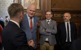 15 maja 2023 r. w Dworze Artusa odbyła się debata "Nowoczesne narodowe państwo dobrobytu" w ramach cyklu Seminariów Toruńskich "Od Mikołaja Kopernika do Jana Pawła II". Jednym z uczestników debaty był prezydent Michał Zaleski. Fot. Wojtek Szabelski