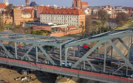 Trwają prace wykończeniowe moście drogowym im. marsz. J. Piłsudskiego. W sobotę 11 grudnia 2021 r. montowanych bedzie kilkaset elementów iluminacji przeprawy. Z tego powodu most zostanie zamknięty dla ruchu aut w godzinach od 6.00 do 17.00. Autobusy komunikacji miejskiej będą kursowały bez zmian, dostępny będzie również ciąg pieszo-rowerowy po stronie zachodniej mostu. Fot. Błażej Antonowicz