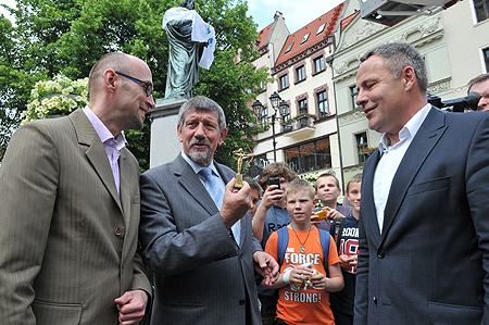 Na pamiątkę spotkania w Toruniu prezydent Bydgoszczy podarował władzom Torunia miniaturową statuetkę bydgoskiej Łuczniczki. - Będziemy na niej ćwiczyć ubieranie toruńskiej koszulki w następnych wyborach - zapowiedział przewodniczący Rady Miasta Torunia Marian Frąckiewicz.