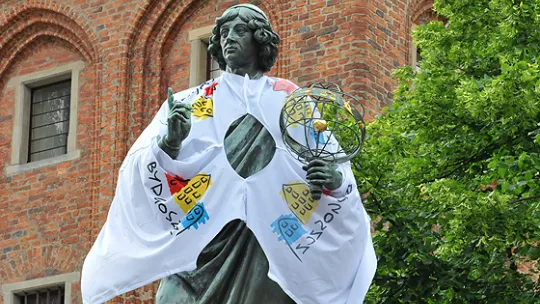 Stało się! Kopernik w koszulce z herbem Bydgoszczy. Zabrakło 200 głosów, żeby Toruń wygrał z sąsiadami zakład o frekwencję wyborczą.