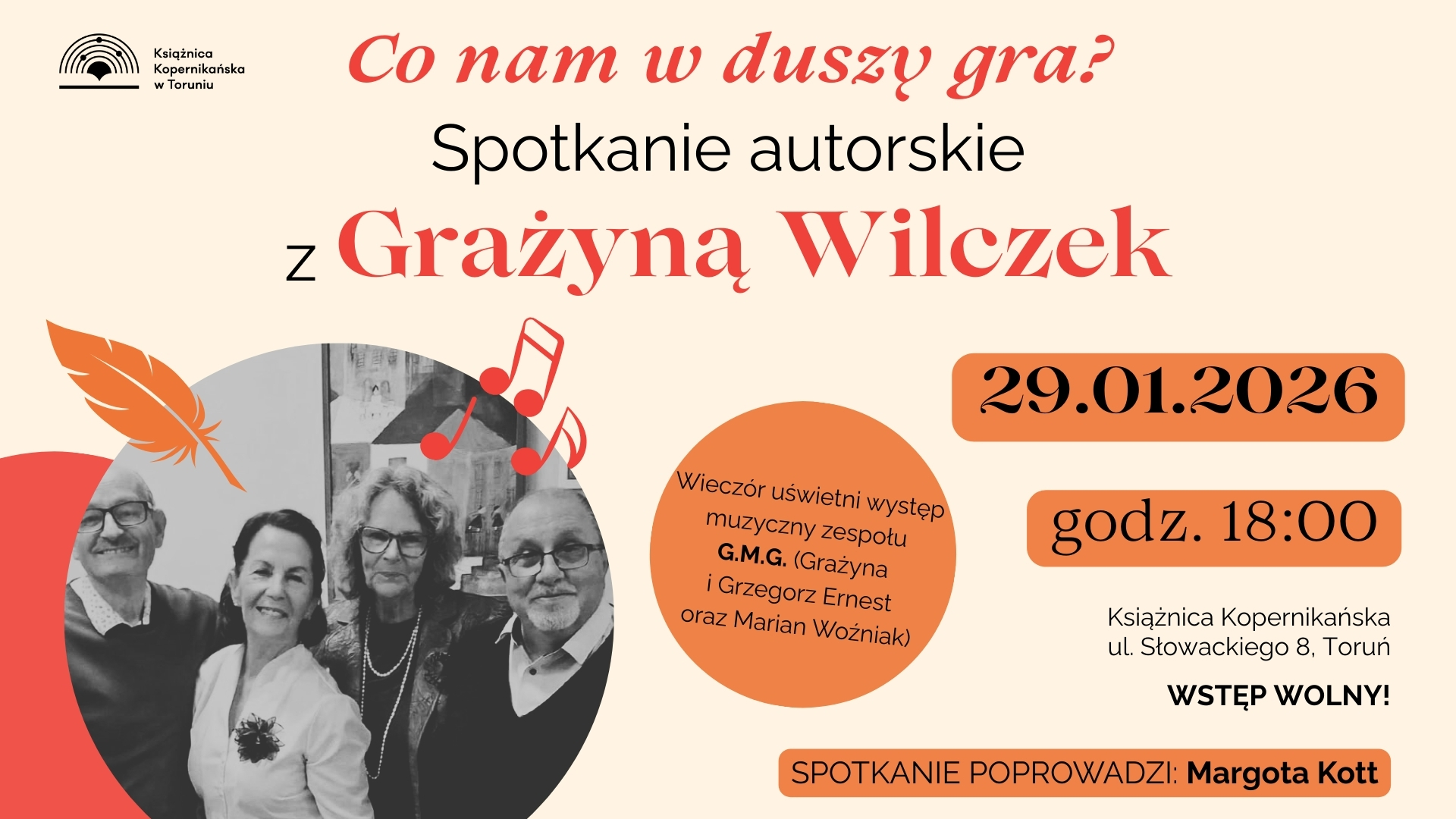 Wiersze Grażyny Wilczek są kolorowe i pełne życia. Toruńska poetka potrafi z niezwykłym talentem uchwycić i opisać otaczający świat. 29 stycznia spotkacie się z nią w Książnicy Kopernikańskiej. W trakcie wieczoru wystąpi zespół G.M.G (Grażyna i Grzegorz Ernest oraz Marian Woźniak). Całość poprowadzi Margota Kott.