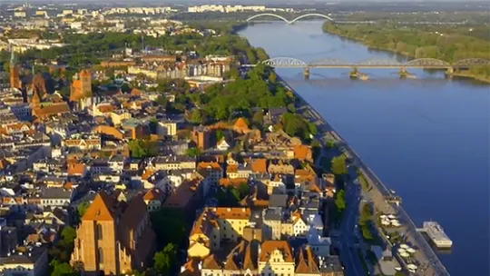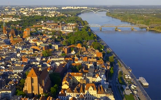 Obejrzyj filmowe ujęcia nowego toruńskiego mostu drogowego z lotu ptaka.