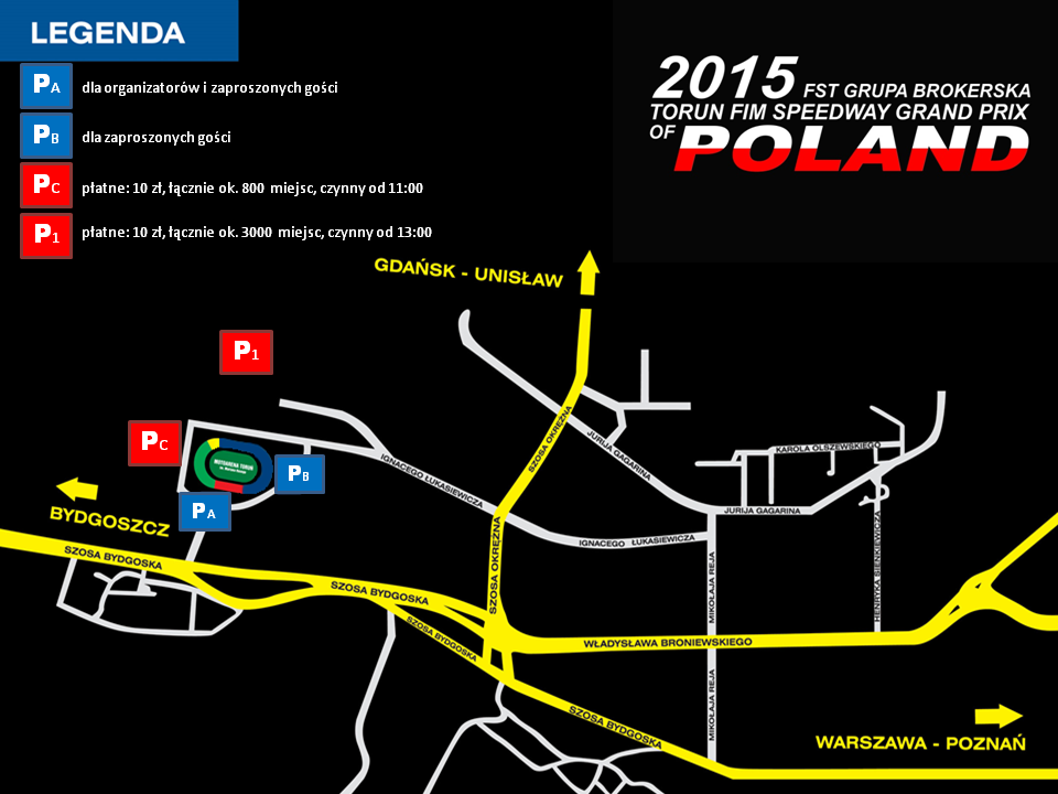 W dniu zawodów przejazd komunikacją miejską w Toruniu w kierunku Motoareny będzie bezpłatny w godzinach od 15.00 do 24.00 dla wszystkich posiadaczy biletów na zawody Grand Prix w Toruniu. Podróżując komunikacją należy mieć przy sobie bilet na Grand Prix w razie ewentualnego wezwania kontrolera. Uruchomione zostaną dodatkowe połączenia komunikacyjne. Dokładna trasa dojazdu do Motoareny, a także więcej informacji znajduje się w informatorze kibica. (na dole artykułu)