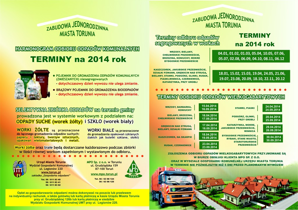 Urząd Miasta Torunia podaje harmonogram odbioru różnego rodzaju odpadów powstających w gospodarstwach domowych w Toruniu.