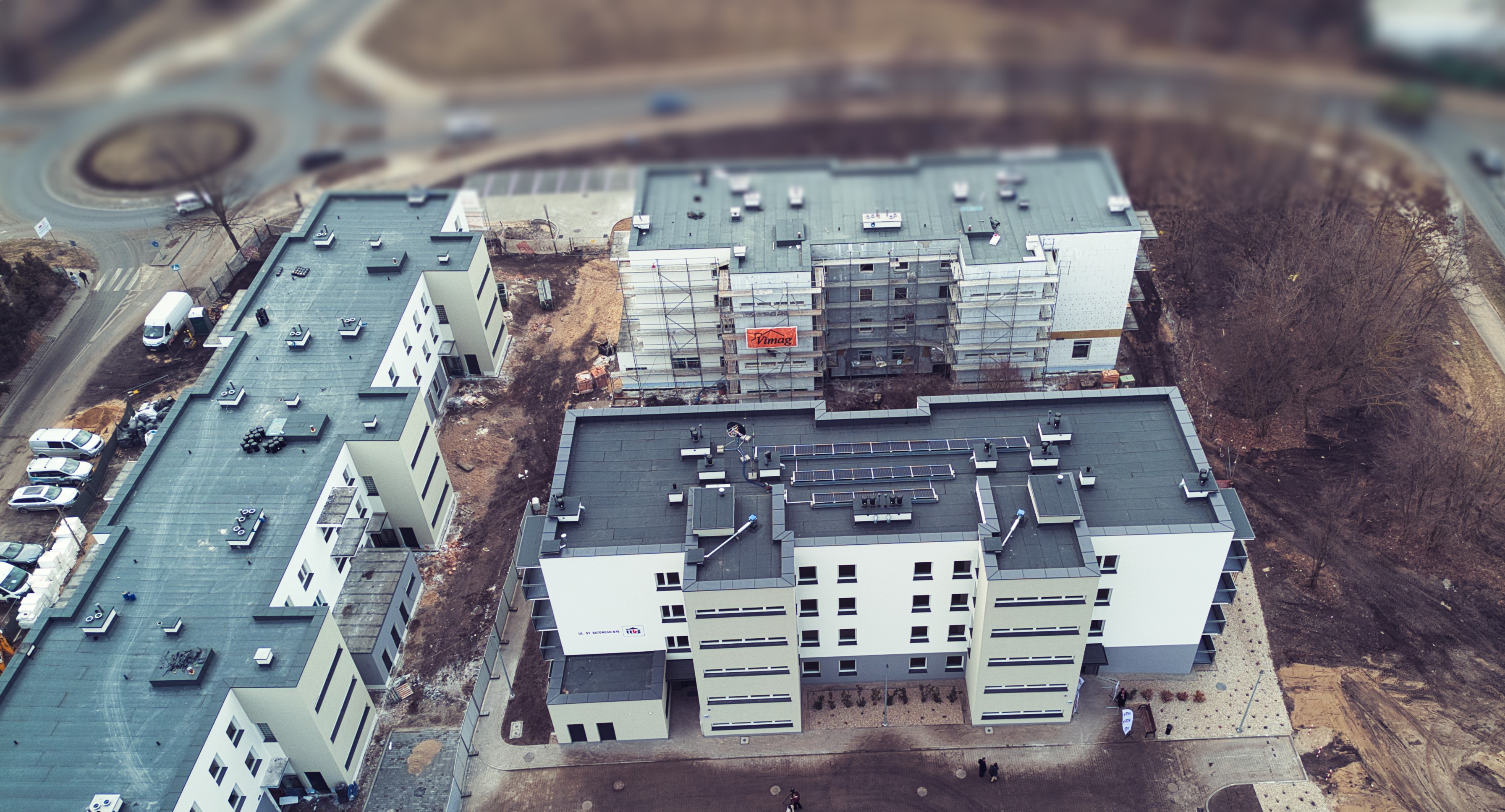 Obiekty budowane są w technologii tradycyjnej - ściany murowane z pustaków ceramicznych, stropy żelbetowe, ściany zewnętrzne budynku docieplone styropianem o gr. 20 cm, okna PCV z nawiewnikami. Pakiety okienne posiadają potrójne szyby, tym samym zapewniają doskonałą izolację mieszkań o każdej porze roku.