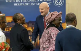 Dyplomaci z kilku państw afrykańskich oraz ludzie biznesu, nauki i kultury zjechali do Torunia na I Międzynarodowy Kongres Afrykanistyczny. Wydarzenie w Urzędzie Marszałkowskim zorganizowały wspólnie Katedra Systemów Politycznych Wydziału Politologii i Nauk o Bezpieczeństwie UMK oraz Ośrodek Studiów Wschodnich i Afrykańskich. Kongres trwa od 21 do 23 lutego 2024 r. Fot. Wojtek SzabelskiSpotkanie z przewodnikami toruńskimi