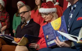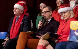 6 grudnia 2023 r. w Szkole Podstawowej nr 9 w ramach akcji "Cała Polska Czyta Dzieciom" znani torunianie czytali książkę pt. "Dzieci Pana Astronoma" Wandy Chotomskiej. Wśród czytających bli: prezydent Michał Zaleski i przewodniczący Rady Miasta Marcin Czyżniewski. Fot. Wojtek SzabelskiTramwaj świąteczny, 6.12.2023 r.