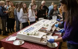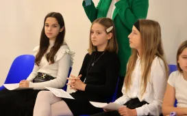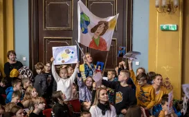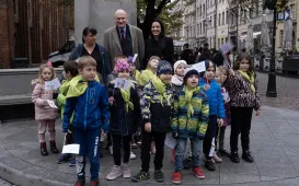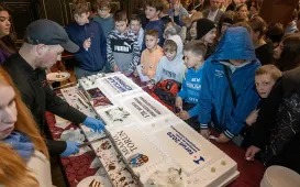 Z okazji 170. rocznicy powstania Mikołaja Kopernika 25 października 2024 r. prezydent Michał Zaleski spotkał się w Dworze Artusa z uczniami toruńskich szkół, by przybliżyć dzieje słynnego toruńskiego monumentu. Fot. Wojtek Szabelski