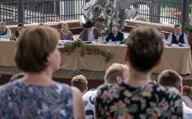 W sobotę 9 września 2023 r. na Scenie Szekspirowskiej w Toruniu aktorzy Teatru Baj Pomorski z gościnnym udziałem prezydenta Torunia Michała Zaleskiego czytali fragment powieści Elizy Orzeszkowej "Nad Niemnem". Fot. Wojtek SzabelskiOtworzyli najważniejszą wystawę Roku Kopernikańskiego
