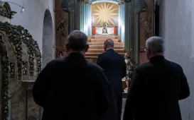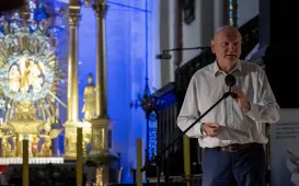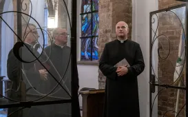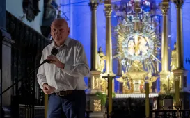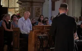 W kościele pw. Wniebowzięcia Najświętszej Marii Panny 16 sierpnia 2023 roku odbył się niezwykły koncert pt. "Gregorian Priests", łączący średniowieczny śpiew chorałowy i współczesną muzykę instrumentalną. Słuchaczy koncertu powitał prezydent Michał Zaleski. Fot. Wojtek Szabelski