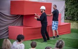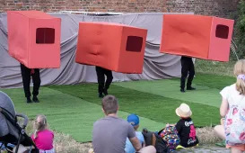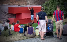 14 lipca 2023 roku rozpoczął się 9. Festiwal Teatrów Ulicznych. W Fosie Południowej obok Zamku Krzyżackiego wystąpił między innymi Teatr Czwarte Miasto ze spektaklem "Mały Gotyk". fot. Wojtek Szabelski