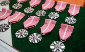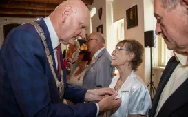 W Ratuszu Staromiejskim w Toruniu 18 toruńskich par odebrało 7 lipca 2023 r. Medale za Długoletnie Pożycie Małżeńskie.W drugiej turze uroczystości prezydent Michał Zaleski wręczył medale 10 parom. Fot. Agnieszka BieleckaJubileusze małżeńskie, 7.07.2023, godz. 14:00