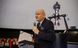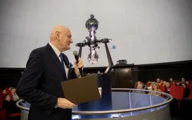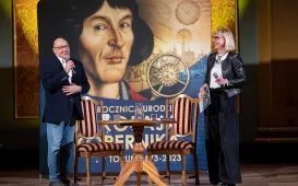 „Copernicus 2473” to najnowszy seans astronomiczny, jaki można oglądać w toruńskim Planetarium. Jego premiera odbyła się 17 lutego 2023 r. w ramach obchodów 550. rocznicy urodzin Mikołaja Kopernika. Udział w pokazie wziął prezydent Michał Zaleski. Fot. Wojtek Szabelski