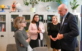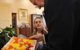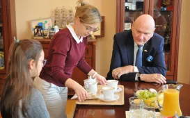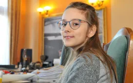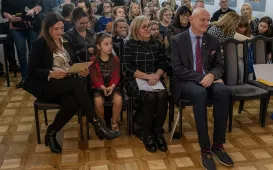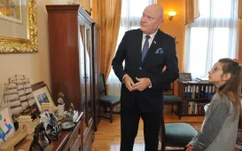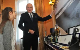8 listopada 2022 r. w Urzędzie Miasta Torunia gościła 9-letnia Zuzanna Derkowska, zwyciężczyni tegorocznej edycji konkursu "Prezydentem być". W nagrodę wraz z tatą przez cały dzień towarzyszyła prezydentowi Michałowi Zaleskiemu w jego codziennej pracy, m.in. w porannej prasówce, przeglądzie pism urzędowych oraz spotkaniu z toruńskimi kombatantami w Dworze Artusa z okazji Święta Niepodległości. Fot. Małgorzata Litwin (UMT), Sławomir Kowalski (Dwór Artusa)