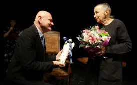 Wybitni aktorzy pojawią w dniach 13-15 maja 2022 r. na scenie teatru Baj Pomorski w ramach 36. Toruńskich Spotkań Teatrów Jednego Aktora. Inauguracja wydarzenia odbyła się 13 maja 2022 r. spektaklem w wykonaniu Ireny Jun "Stara kobieta wysiaduje". Artystke powitał prezydent Michał Zaleski. Fot. Adam Zakrzewski