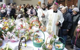 Po przerwie spowodowanej pandemią tradycja świecenia pokarmów powróciła na Rynek Staromiejski. W Wielką Sobotę, 16 kwietnia 2022 r. wielkanocne koszyki poświęcił biskup toruński Wiesław Śmigiel. fot. Adam Zakrzewski