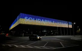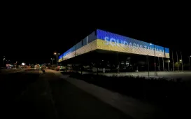 Kilka charakterystycznych obiektów w Toruniu przybrało 25 lutego 2022 r. żółto-niebieskie barwy w ramach solidarności z walczącą Ukrainą. Symboliczne podświetlenie pojawiło się na moście marsz. J. Piłsudskiego, budynkach CKK Jordanki, Collegium Maximum UMK i sportowej Areny Toruń. Codziennie pod pomnikiem Kopernika kolejne osoby, Polacy i Ukraińcy, manifestują poparcie dla broniącego swojej niezawisłości narodu. Fot. Sławomir Kowalski