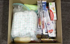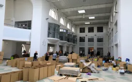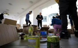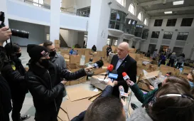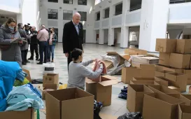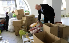 W Centrum Targowym Park znajduje się punkt główny, do którego trafiają dary z 52 punktów zbiórek prowadzonych przez miasto. W dniu 2 marca 2022 r. punkt w CT Park odwiedził prezydent Michał Zaleski. Fot. Sławomir Kowalski