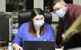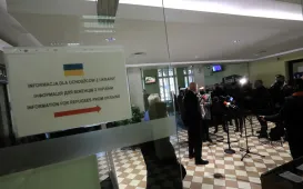W dniu 2 marca 2022 r. na dworcy Toruń Główny, gdzie działa punkt informacyjny dla uchodźców z Ukrainy, odbyła się konferencja prasowa wojewody kujawsko-pomorskiego Mikołaja Bogdanowicza i prezydenta Michała Zaleskiego. Fot. Sławomir Kowalski