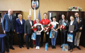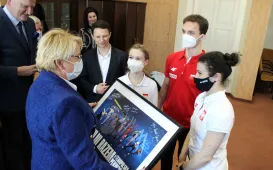 Para taneczna Natalia Kaliszek i Maksym Spodyriev oraz solistka Ekaterina Kurakova zostali nagrodzeni przez władze miasta Torunia za udział w Igrzyskach Olimpijskich.Copernicus Cup Toruń 2022 - konferencja