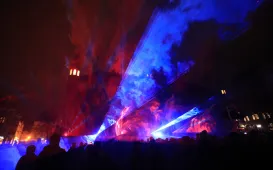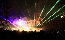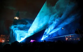 "Światełko do nieba" o godz. 20:00 na Rynku Staromiejskim zakończyło toruński 30. finał Wielkiej Orkiestry Świątecznej Pomocy w dniu 30 stycznia 2022 r. W tym roku był to pokaz laserowy. Fot. Sławomir Kowalski30. finał WOŚP