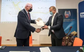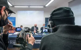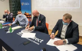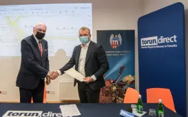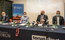 9 listopada 2021 r. w siedzibie MZK odbyła się konferencja podsumowująca projekt "Poprawa infrastruktury przystanków autobusowych w Toruniu poprzez budowę systemu informacji pasażerskiej w czasie rzeczywistym oraz modernizację przystanków”. W konferencji udziałe wziął prezydent Torunia Michał Zaleski, dyrektor Wydziału Gospodarki Komunalnej Marcin Kowallek, Główny Specjalista w Referacie ds. Publicznego Transportu Zbiorowego WGK Arkadiusz Paprocki oraz przedstawiciele wykonawcy - firmy GMV Innovating Solutions Sp. z o.o. Fot. Natalia Przytarska