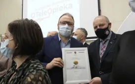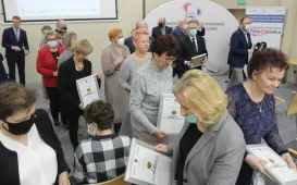 W Urzędzie Marszałkowskim w dniu 8 listopada 2021 r. grupa toruńskich seniorów odebrała tzw. bransoletki życia - urządzenia wspierające osoby niesamodzielne, potrzebujące pomocy w codziennym funkcjonowaniu. W spotkaniu uczestniczył także zastępca prezydenta Paweł Gulewski. Fot. Adam Zakrzewski