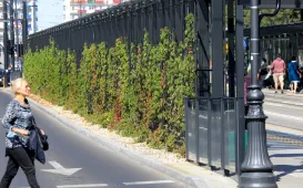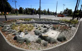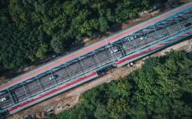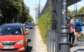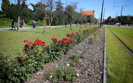 Bujnie rozwija się zieleń na przebudowanym placu Rapackiego w Toruniu. Węzeł komunikacyjny miasta zdobią obsiane trawą torowiska, nowe nasadzenia drzew i krzewów ozdobnych oraz oplecione pnączami "zielone przystanki". Fot. Sławomir KowalskiMost z drona
