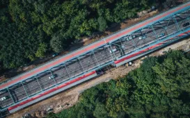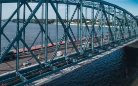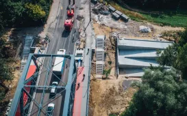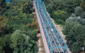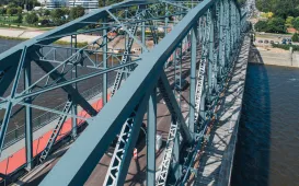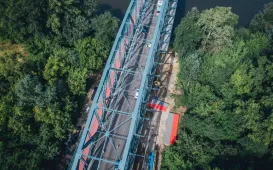 We wrześniu 2021 po wschodniej stronie mostu drogowego im. marsz. J. Piłsudskiego w Toruniu montowane są panele. Powstanie z nich ciąg pieszo-rowerowy, identyczny jak po przeciwnej, zachodniej stronie przeprawy. Fot. MZD/Błażej Antonowicz Focus Art (zdjęcia lotnicze)W 41. rocznicę Porozumień Sierpniowych