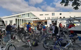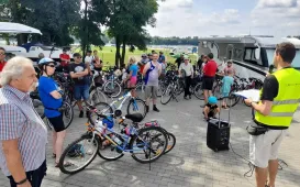 Blisko 150 rowerzystów odwiedziło w niedzielę 18 lipca 2021 r. trzy toruńskie obiekty sportowe. W ramach „Lata bez nudy w Toruniu” uczestnicy rajdu rowerowego „Szlakiem toruńskiego sportu” zwiedziło korty tenisowe przy Skarpie, przystań Toruń i najnowszą inwestycję MOSiR-u – basen Aqua Toruń. Fot. Stowarzyszenie GoSport!Luminarium Albesila