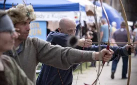 Turniej łuczniczy, pokazy walk rycerskich, warsztaty tańca średniowiecznego, konkursy, zabawy dla dzieci – to tylko niektóre atrakcje festynu z okazji Dnia Hanzy, który odbył się 15 maja 2021 r. w Fosie Zamkowej. Wydarzenie było częścią inauguracji sezonu turystycznego w Toruniu. Fot. Wojtek SzabelskiSpotkanie z mistrzami wioślarskimi