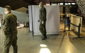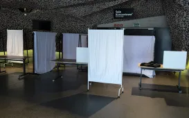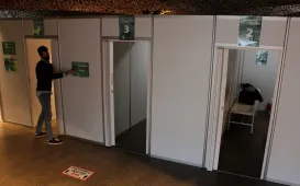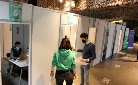 Dwa namioty przed CKK Jordanki oraz gotowe stanowiska we foyer budynku - mobilny punkt szczepień jest już gotowy. Szczepienia w ramach akcji "Zaszczep się w majówkę" będą odbywać się tam w dniach 1-4 maja 2021 r. Fot. Adam Zakrzewski