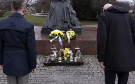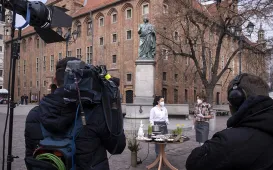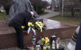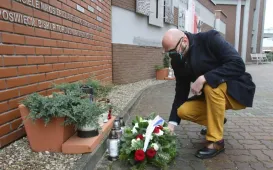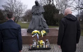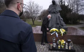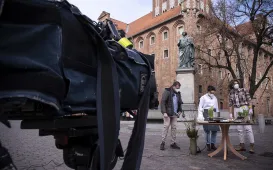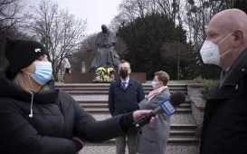 2 kwietnia 2021 r., w 16. rocznicę śmierci Jana Pawła II, kwiaty pod jego toruńskim pomnikiem złożyli prezydent Torunia Michał Zaleski i przewodniczący Rady Miasta Torunia Marcin Czyżniewski. Fot. Wojtek SzabelskiDzień Dobry TVN nadaje z Torunia