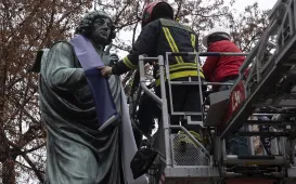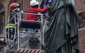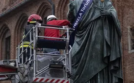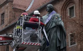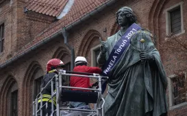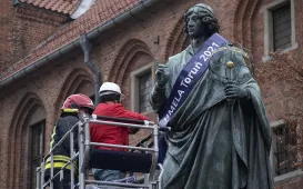 Już dzisiaj wielkie otwarcie Halowych Mistrzostw Europy w Lekkiej Atletyce Toruń 2021! Z tej okazji 4 marca 2021 r. pomnik Mikołaja Kopernika przybrany został w symboliczną szarfę, która zastąpiła wcześniejszy plastron. Fot. Wojciech SzabelskiMotoambulans dla Torunia